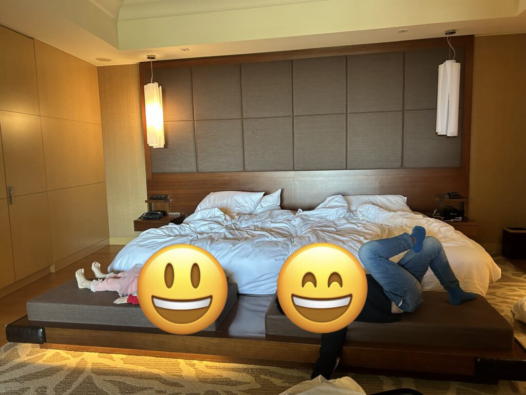 - – 宿泊したスーペリアスイートツインは広く、ベッドをくっつけて添い寝も安心、冷蔵庫内ドリンク無料・子ども用アメニティも用意されていた。