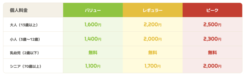 | チケット種類 | バリュー(主に平日) | レギュラー(土日) | ピーク(繁忙期) |