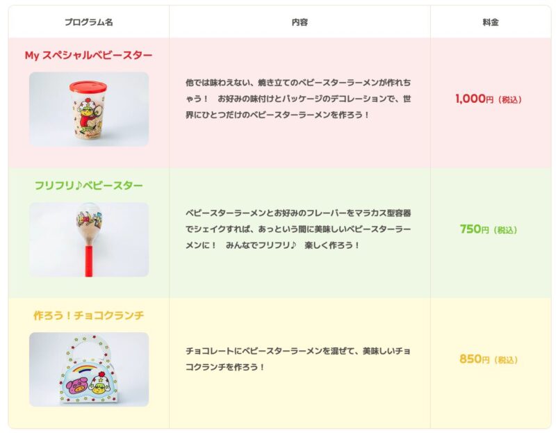 - Myスペシャルベビースター: お好みの味付けとパッケージのデコレーションで、世界にひとつだけの焼き立てベビースターラーメンが作れる一番人気体験(所要時間:約40分)。