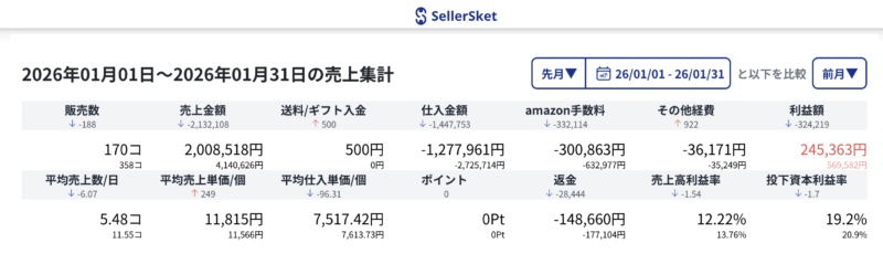 2026年1月の副業せどりは、売上約200万円、純利益約24.5万円という結果でした。