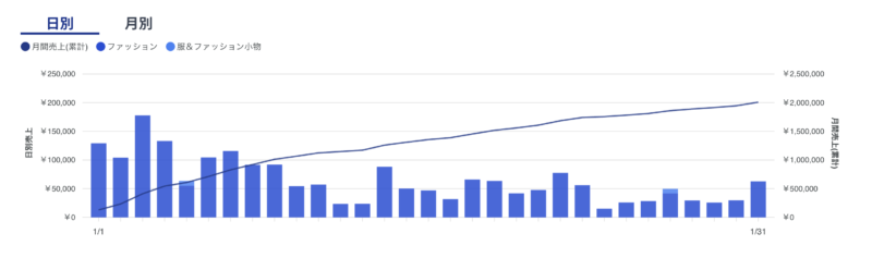 1月の売上はこちらのグラフのとおり上旬は好調に推移しましたが中旬以降失速しました。例年のことなのであまり気にしていません。